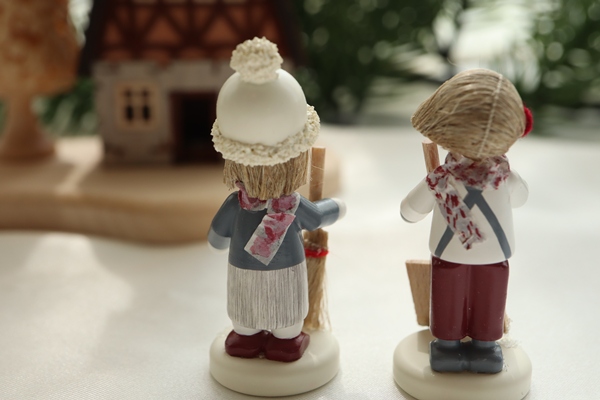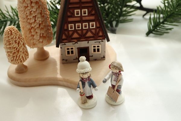 ほうきを持った女の子。家などの建物の前に立たせてあげるとお話が生まれそうです。ニット帽や足元に雪がキラキラしています。一人でも男の子とペアでも。