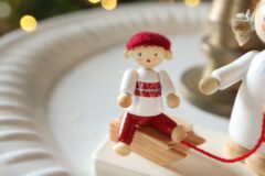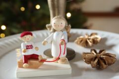 赤いベレー帽とアーガイル模様のセーターが可愛い人形が乗ったワゴンを引く天使です。
