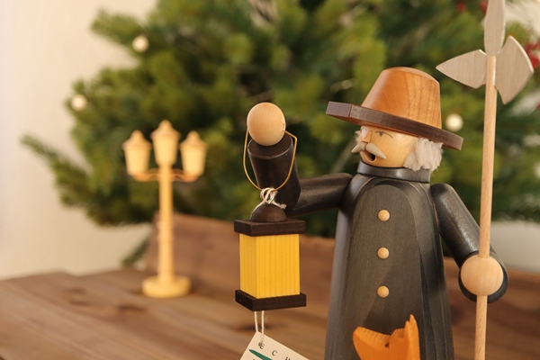 柔らかな表情と落ち着いた色合いの夜警の煙だし人形です。