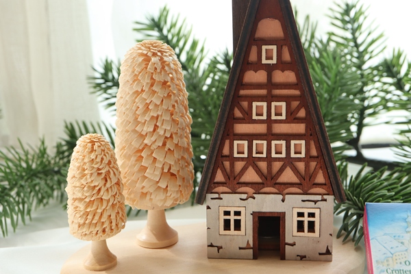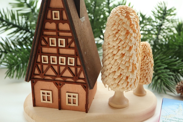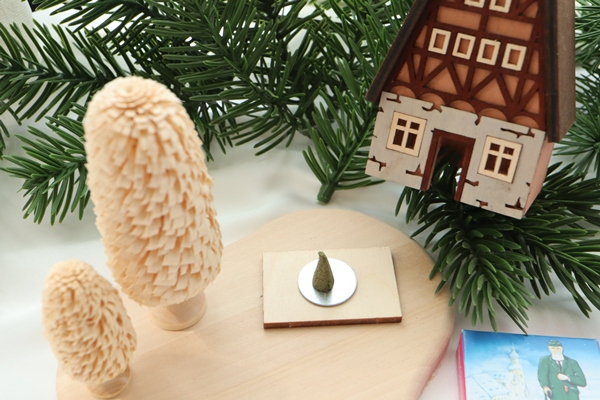 家の中は空洞になっていて、お香をセットする台が付いています。お香を載せ火をつけ家をかぶせると煙突から良い香りの煙が立ち上ります。もしゃもしゃの削り木と家のみのシンプルさなので背景としても活躍します。