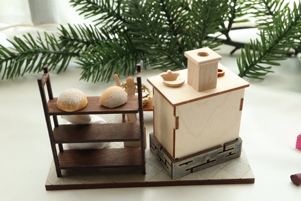 窯の中は空洞になっていて、お香をセットする台が付いています。お香を載せ火をつけ窯をかぶせると煙突から良い香りの煙が立ち上ります。横の棚には焼きあがったばかりの丸パンや小麦粉も。