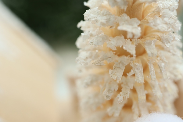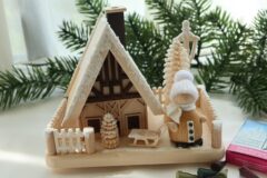 屋根も家の周りの柵も木の枝にもキラキラパウダースノー。男の子の白いニット帽とマフラーが温かそうです。家の中は空洞になっていて、お香をセットする台が付いています。お香を載せ火をつけ家をかぶせると煙突から良い香りの煙が立ち上ります。削り木と家と男の子が柵の中でコンパクトにまとまっています。