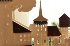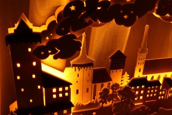 クリスマス色は無いので年中お楽しみいただけます。高い塔と雲間から漏れ出る光が温かく裏面にもひと手間かかっていて、デザインのこだわりが感じられます。