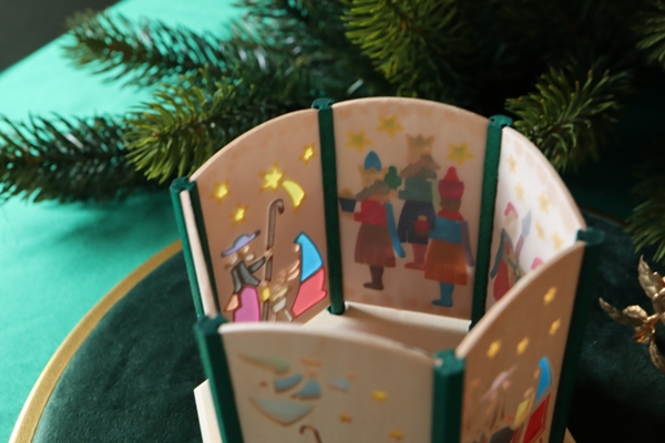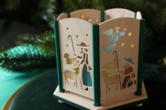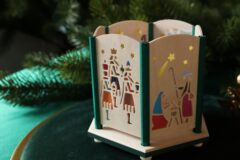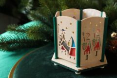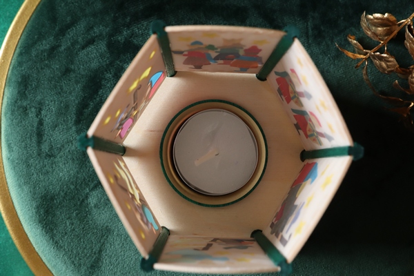 白木のキャンドルホルダーの側面に、6面全部違うモチーフが切り抜かれトランスパレントペーパーが貼られています。